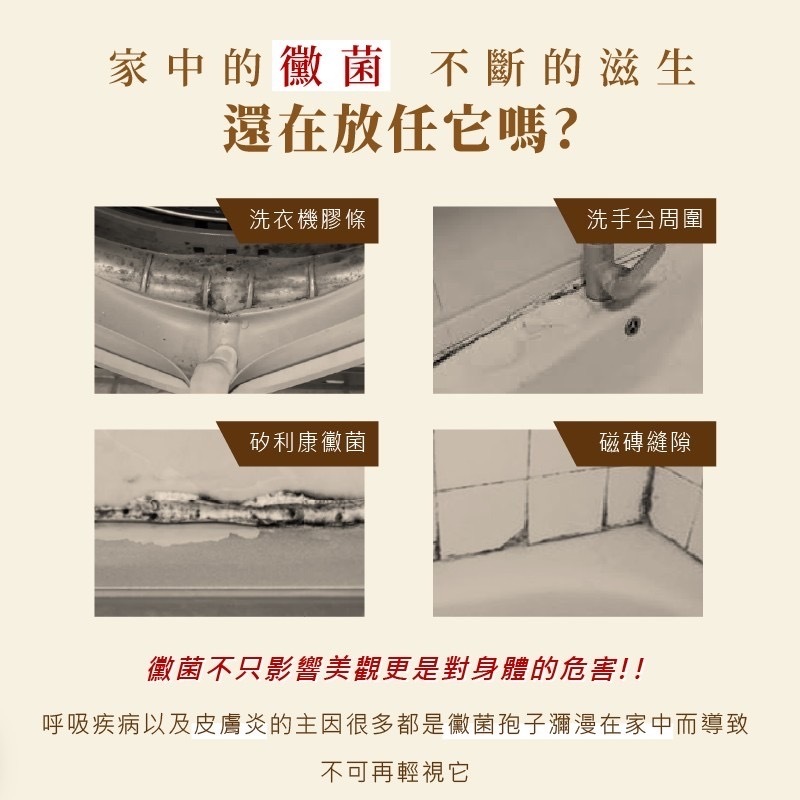 3/若遇頑強黴菌,噴灑於目標,靜置4-6小時後再清洗即可,重複以上動作數次效果更佳